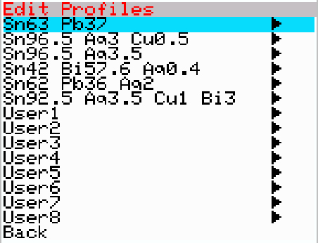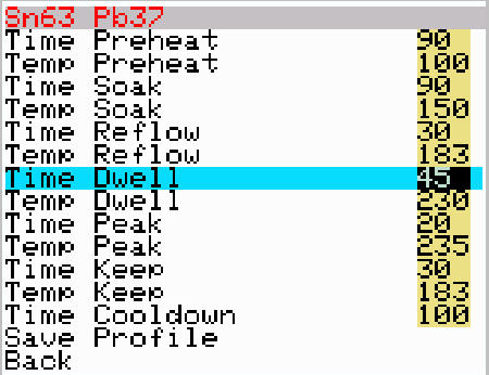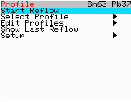 You have the option to start the reflow process, select the reflow profile, edit one of the profiles, show the last reflow data, and setup different configuration options.