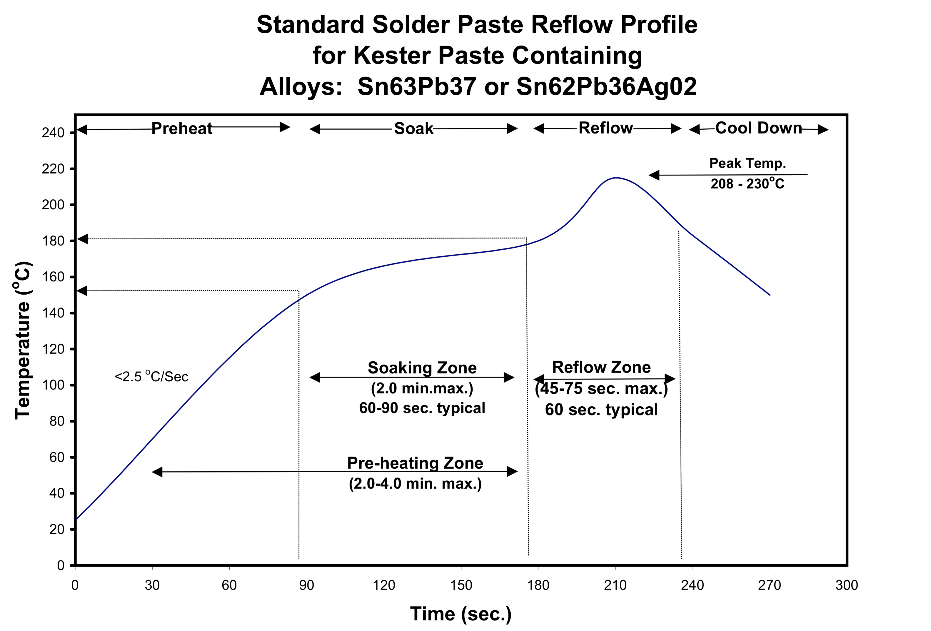 The actual time and temperature requirements is dependent on the type of solder paste used. For a typical Sn63/Pb37 (tin/lead) solder paste, the recommended reflow profile is below: