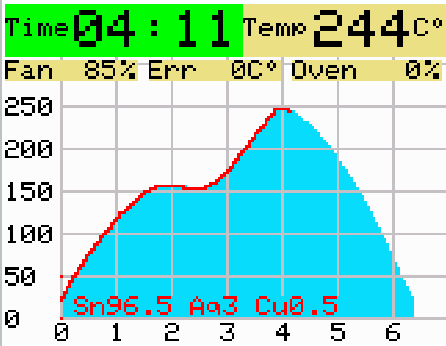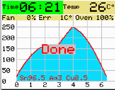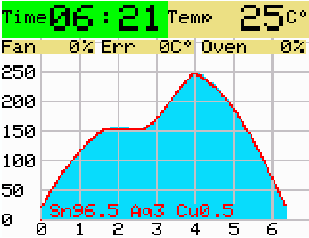 This option starts the actual reflow process. On the left upper corner you can see the elapsed time, on the right - the current temperature.