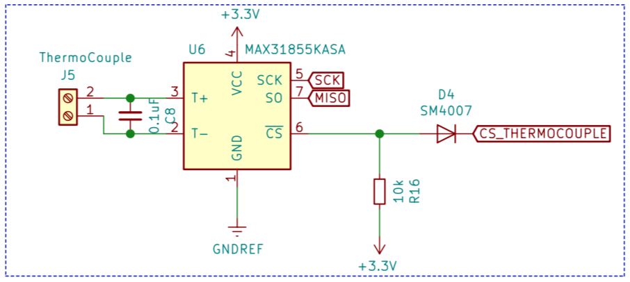I need to interface the MCU with USB out so the actual processor that I’ve chosen is the ATmega32U4 running at 3.3V and 8Mhz. Since the MAX31855 requires 3.3V, that's the voltage I chose for the DC side. ATmega32U4 is only rated to run at 8MHz at this voltage (it can run at 16MHz at voltages > 3.6V).