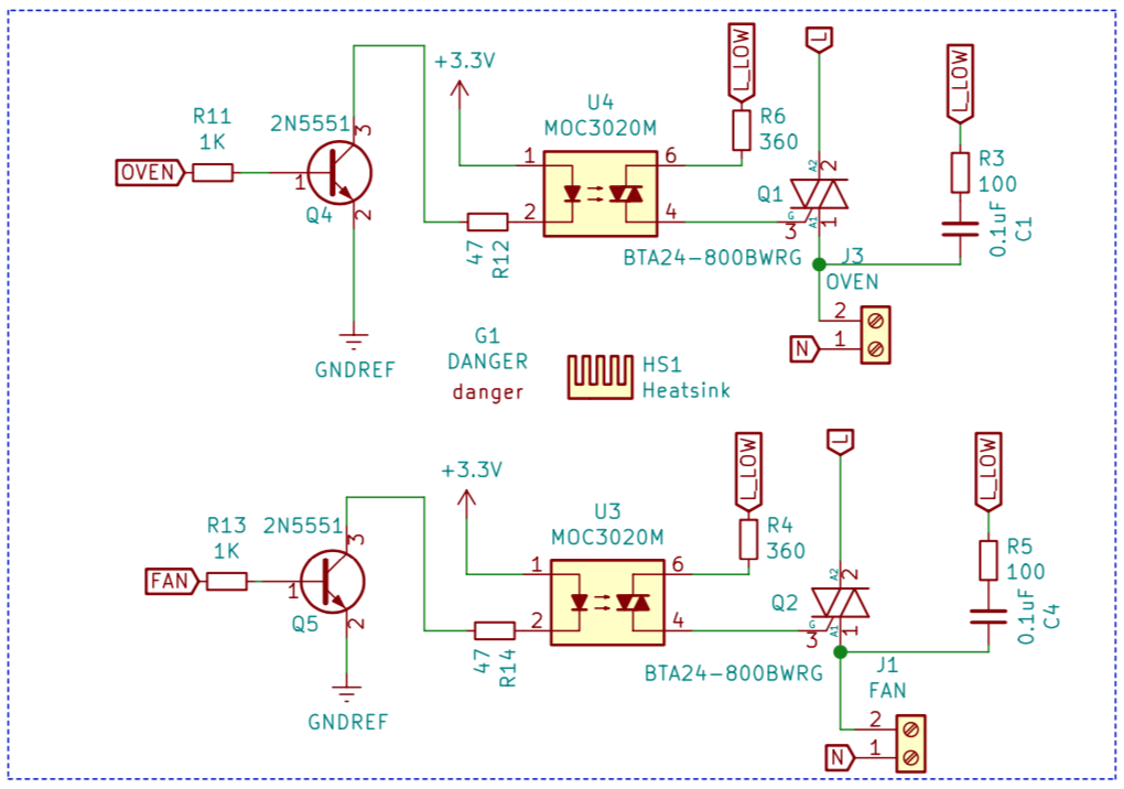 I use a MOC3020S (SMD version of MOC3020M) TRIAC optocoupler to control the TRIAC’s gate and the driving circuit is taken from the MOC3020 datasheet. A snubber is used to prevent false triggering of the TRIAC when the load being driven has an inductive component such as the fan on the oven that I’m using.