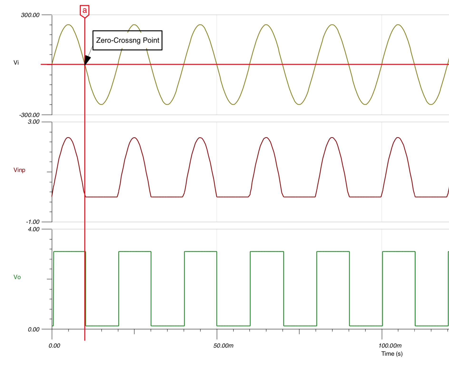 The comparator generates a square signal centered on zero-crossing points. MCU interrupt fires on RISING and FALLING signal.
