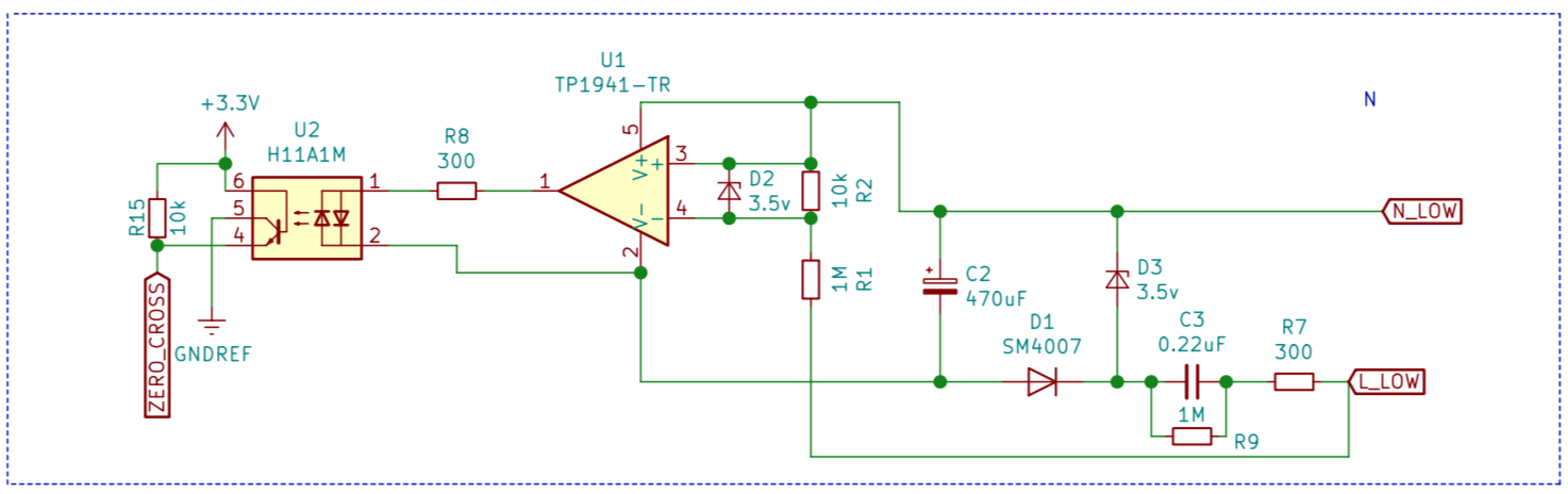 The power supply provides 3.3V to rail-to-rail comparator unit, which drives the optocoupler (H11A1M).